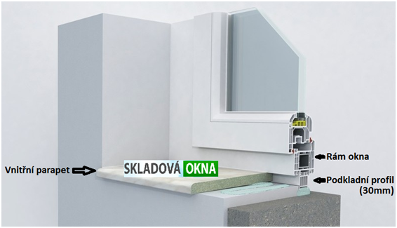 Podkladní profil je také nazýván jako parapetní doraz nebo transportní profil. Tento profil je vysoký 30 mm, je odnímatelný a je součástí každého námi dodávaného okna. Slouží jednak pro transport oken, aby okno při převozu nesedělo přímo na rámu a také jako parapetní doraz pro vnitřní parapet a snadné ukotvení parapetu venkovního. Parapet vnitřní se pak k podkladovému profilu přiráží – viz. znázornění na níže uvedeném obrázku.