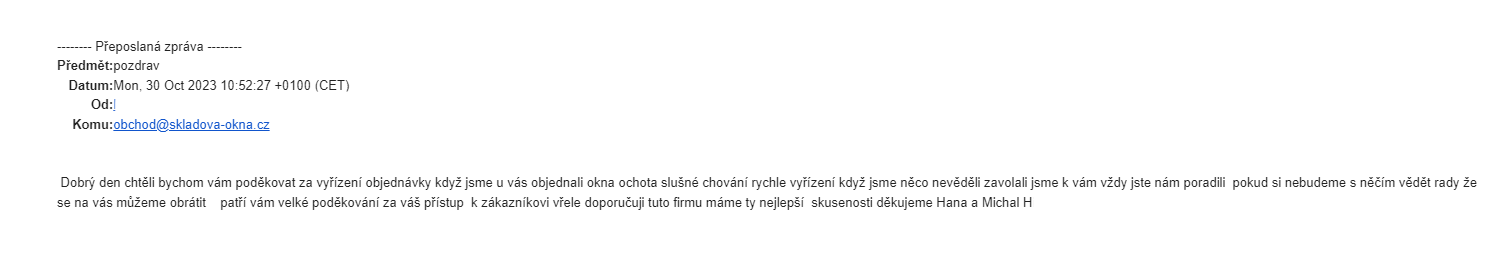 „Dobrý den, chtěli bychom vám poděkovat za vyřízení objednávky, když jsme u vás objednali okna ochota slušné chování rychle vyřízení, když jsme něco nevěděli, zavolali jsme k vám vždy jste nám poradili pokud si nebudeme s něčím vědět rady že se na vás můžeme obrátit patří vám velké poděkování za váš přístup k zákazníkovi vřele doporučuji tuto firmu máme ty nejlepší skusenosti. Děkujeme.“ Hana a Michal H.