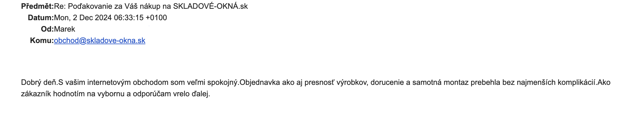 Dobrý deň.S vašim internetovým obchodom som veľmi spokojný.Objednavka ako aj presnosť výrobkov, dorucenie a samotná montaz prebehla bez najmenších komplikácií.Ako zákazník hodnotím na vybornu a odporúčam vrelo ďalej.