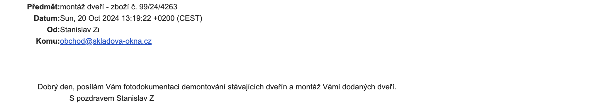Dobrý den, posílám Vám fotodokumentaci demontování stávajících dveřín a montáž Vámi dodaných dveří.
