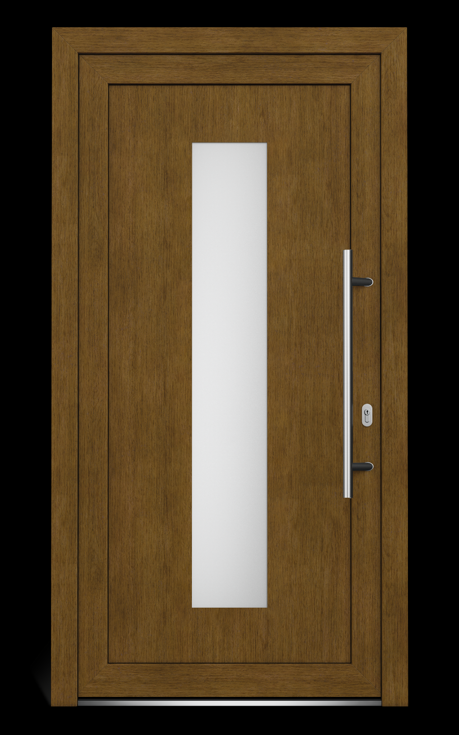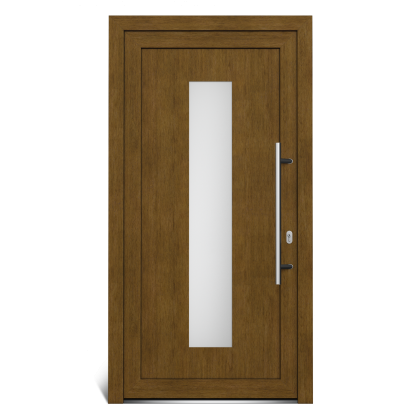 Dveře jsou v pravém provedení a otevírají se dovnitř. Výplň křídla tvoří panel o tloušťce 36 mm (2 HPL desky o tloušťce 2 mm + mezi nimi je 32 mm silná polyuretanová pěna) a pískované dvojsklo. Dekorační folie jsou unikátní pro každý profilový systém a barva či dekor se u jednotlivých profilů může lišit. Barva folie zlatý dub u profilového systému ALUPLAST je odlišná od folie zlatý dub u profilového systému PREMIUM a REHAU.