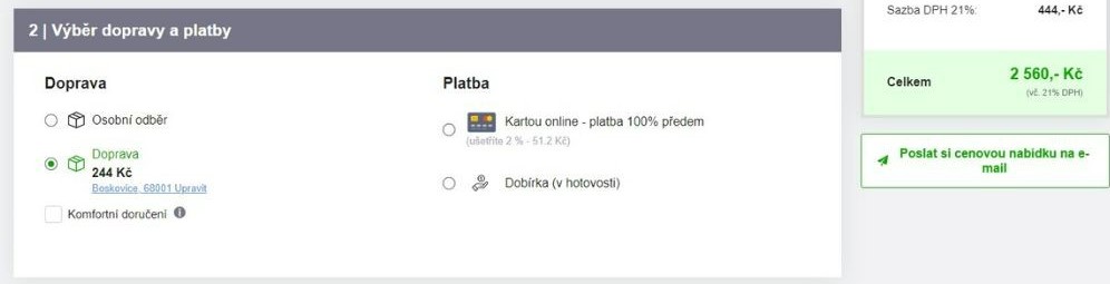 8. Potom už stačí jen vybrat způsob dopravy a platby. Případně si přečtěte více informací o možnostech doručení a o způsobech platby.