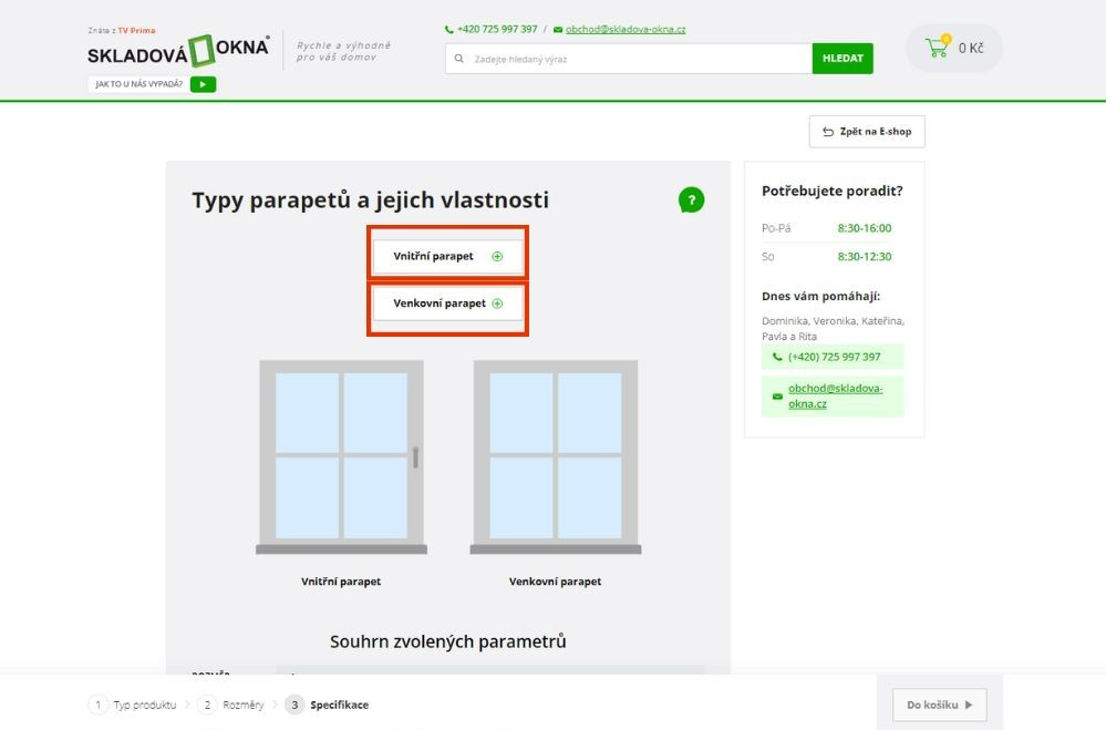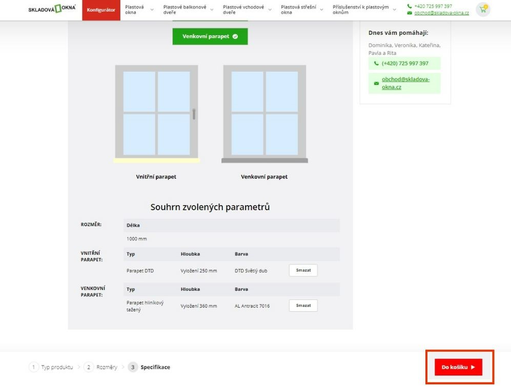 6. Po potvrzení výběru se objeví souhrn parametrů. Zkontrolujte jej a potvrzením přidejte parapety do košíku.