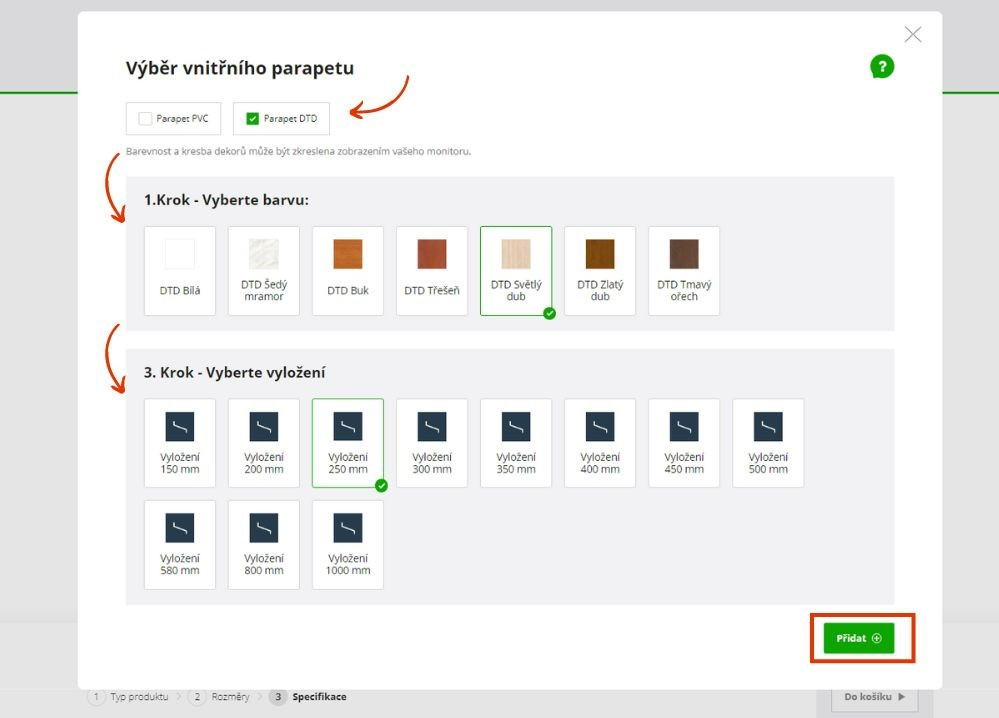 U vnitřního i vnějšího parapetu máte na výběr materiál. Pro interiér je k dispozici plastový (PVC) nebo dřevotřískový (DTD) parapet, pro exteriér hliníkový ohýbaný nebo hliníkový tažený. Posléze si navolíte barvu a hloubku vyložení.