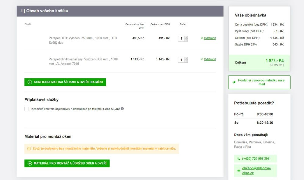 7. V košíku můžete zvolit ještě doplňkovou příplatkovou službu Technická kontrola objednávky nebo vyberte materiál pro montáž.