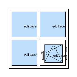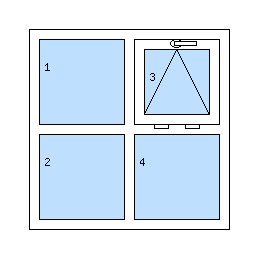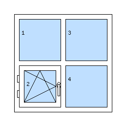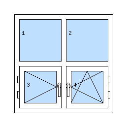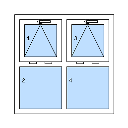 Čtyřkřídlé oknood 6 050 KčDole vlevo pevný (fixní) díl, vpravo otvíravo-sklopné křídlo pravé, nahoře 2x pevný (fixní) díl