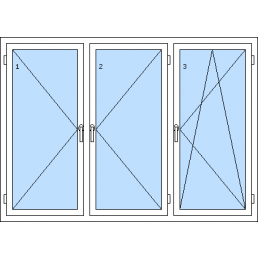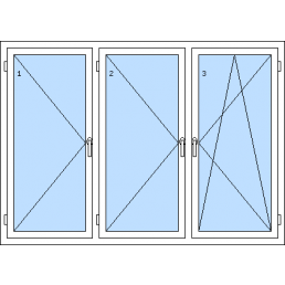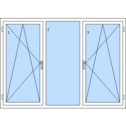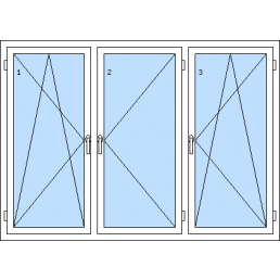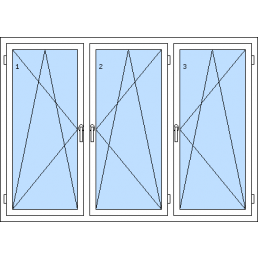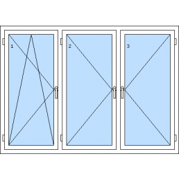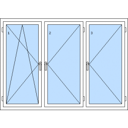 Trojkřídlé oknood 6 718 Kč1. Křídlo otvíravo-sklopné levé, 2. Křídlo otvíravo-sklopné levé, 3. Křídlo otvíravo-sklopné pravé