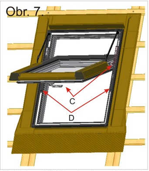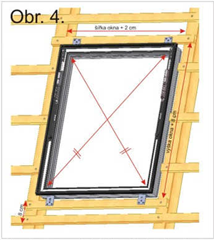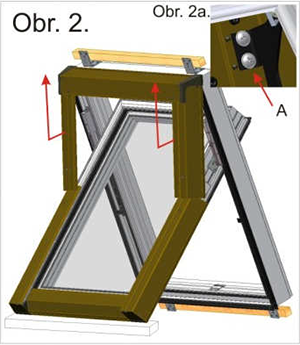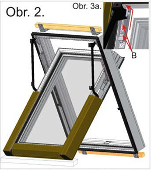 Krok 3 ![]() Po odstranění horní části oplechování povolit zajišťovací šrouby B a rozpojit kování jak je nakresleno na Obr.3a. Toto provést současně na levé i pravé straně. Vyjměte opatrně křídlo a položte ho na čistou a měkkou podložku. Odšroubujte horní a dolní dřevěnou transportní lištu. | Krok 4 ![]() Připravte otvor pro vložení rámu jak je znázorněno na Obr.4. Připevněte pomocí vrutů rám do kontra latí, vždy po třech vrutech na jeden montážní úhelník. POZOR: je třeba dbát na správné vycentrování a rozteč úhlopříček max. rozdíl 1mm. |