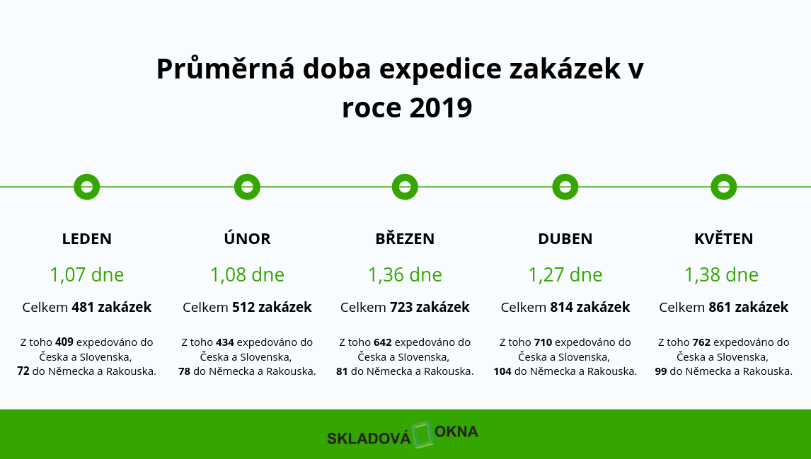 Na našem skladě to prostě odsýpá a práce nám jde od ruky. Balíme okna jako na běžícím páse a v rychlosti dodání zboží se snažíme stále zlepšovat. V České republice máme největší sklad s plastovými okny, a právě proto můžete mít naše okna už do tří dnů doma. Že chcete vidět důkazy?Skladovost a rychlé dodání je naše priorita. Jakmile jsou okna skladem, expedujeme je z našeho skladu následující pracovní den. Okna a dveře našim zákazníkům odchází téměr okamžitě. Spočítali jsme průměrnou dobu expedice zakázek za konkrétní měsíce od začátku roku. Podívejte se, jak si zatím vedeme.