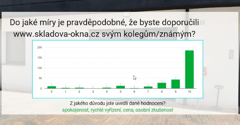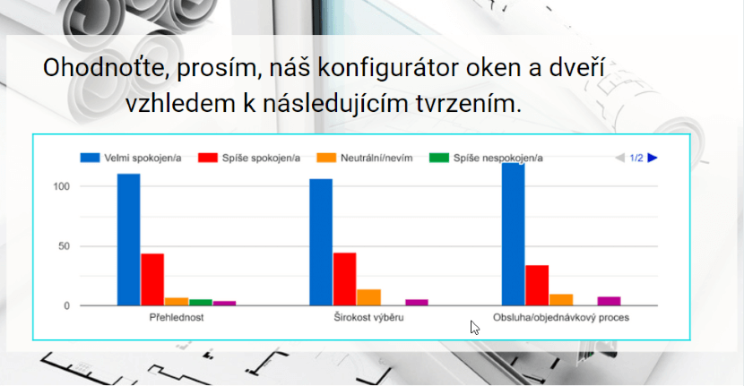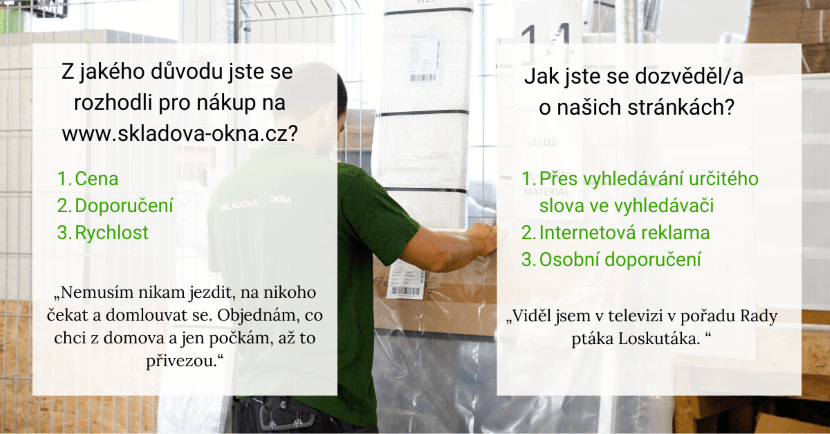 - 43 % lidí nakoupilo zboží skladem a 56 % okna a dveře na míru přes konfigurátor, přičemž i u zboží na objednávku chválili rychlost dodání.