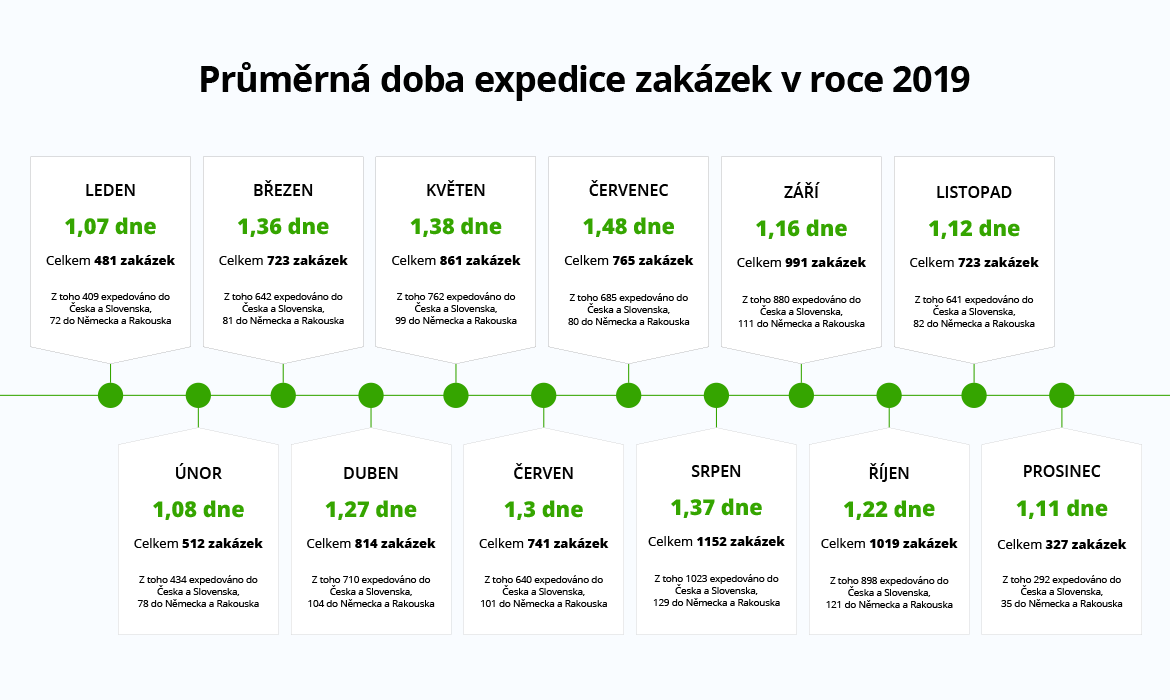 Nejen nízká cena, ale také velmi krátká doba dodání. To jsou naše hlavní přednosti. Podívejte se, jak rychle jsme v jednotlivých měsících roku 2019 dokázali objednávky vyexpedovat.