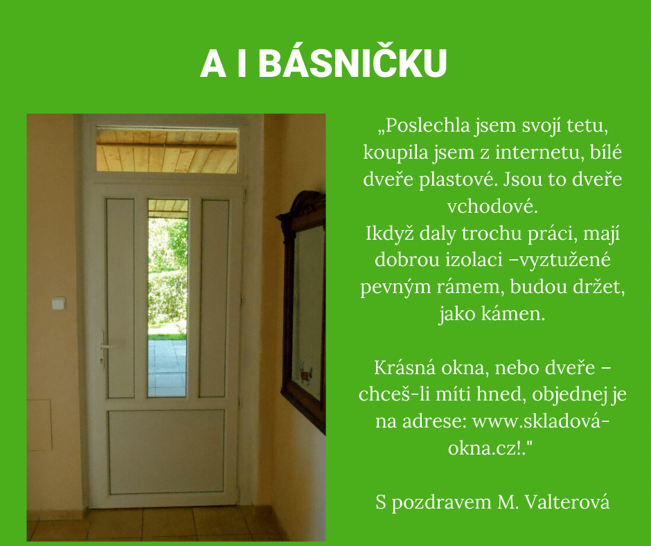 - „Dobrý den, čas letí jako voda, je to právě rok co jsem oslovila e-shop Skladová okna. Pořídila jsem francouzské okno se vstupem na zahradu. Okno povýšilo můj dům o vyšší úroveň. Okno mi dělá jen radost, když jej otevřu jsem spojená s kouskem přírody v zahradě. V pokoji je víc světla, i v zimě se osvědčilo. Funguje k mé radosti. Ještě touto cestou, bych chtěla poděkovat kolektivu Skladová okna a v neposlední řadě paní Vašíčkové za její příkladný přístup k zákazníkovi.” S pozdravem Z. Konečná