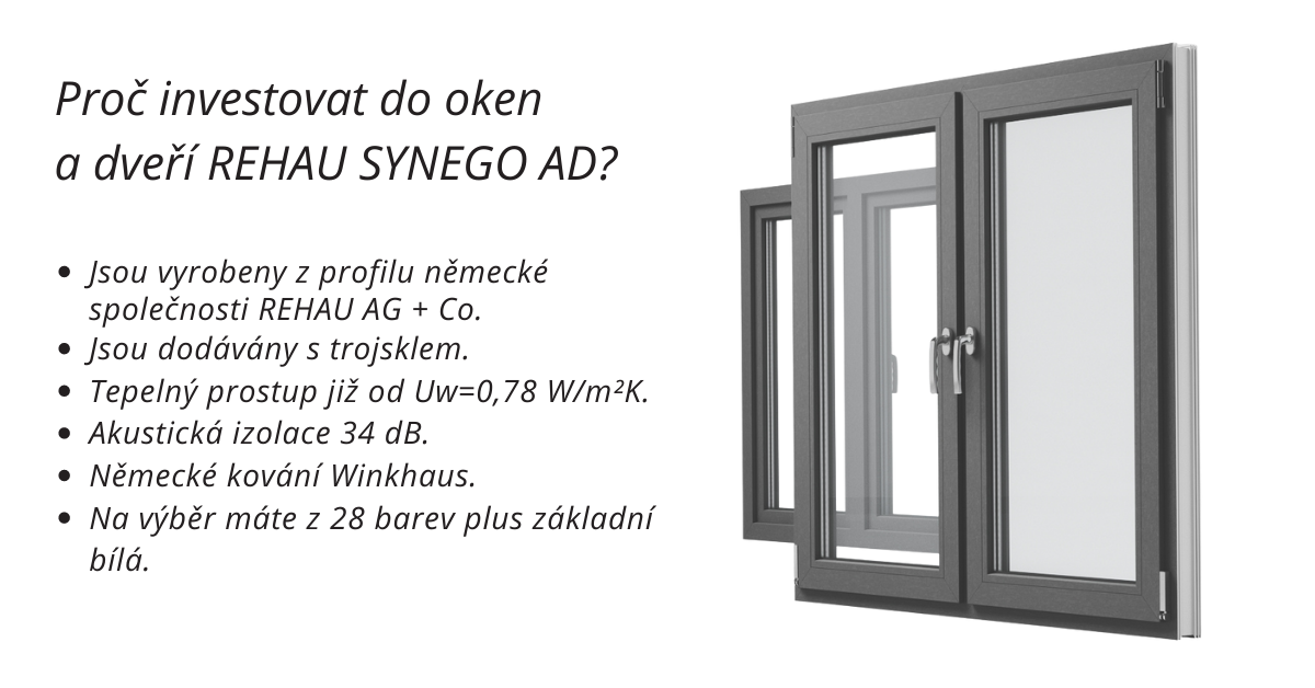 Uvědomujeme si neustále rostoucí tlak na úsporu energie, a tak v návaznosti na poptávku od zákazníků rozšiřujeme náš sortiment o německý profil REHAU SYNEGO AD. Ten je již ve standardu dodáván s trojsklem. Vyhovuje i normám pro nízkoenergetické a pasivní domy. Profil REHAU je šestikomorový a má stavební hloubku 80 mm.Okna a dveře (vchodové hlavní a vedlejší, sklopně-posuvné) REHAU SYNEGO AD si snadno navolíte v našem online konfigurátoru. K dispozici jsou dvě varianty křídel: rovné – typ klasik, předsazené zaoblené – typ round line.