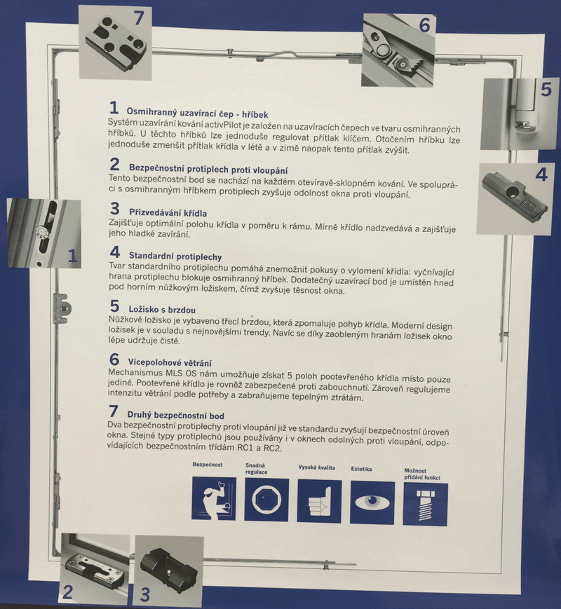 Okna REHAU Smartline+ mají celoobvodové kování od německého výrobce Winkhaus. Kování má bezpečnostními body, které snižují riziko vniknutí zloděje do zahradního domku. Bezpečnostní body v kombinaci s osmihranným uzavíracím čepem (hříbkem) zvyšují odolnost proti vloupání.