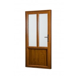 Dveře jsou z vnitřní strany bílé, z venkovní strany je použita fólie v dekoru zlatý dub. Součinitel prostupu tepla dveřmi Uw=1,4 W/m²K.